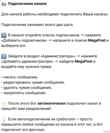 Но помните, что часто для полноценной работы вам нужно добавлять чат-бот в администраторы вашего канала. Делайте это аккуратно и на свой страх и риск.